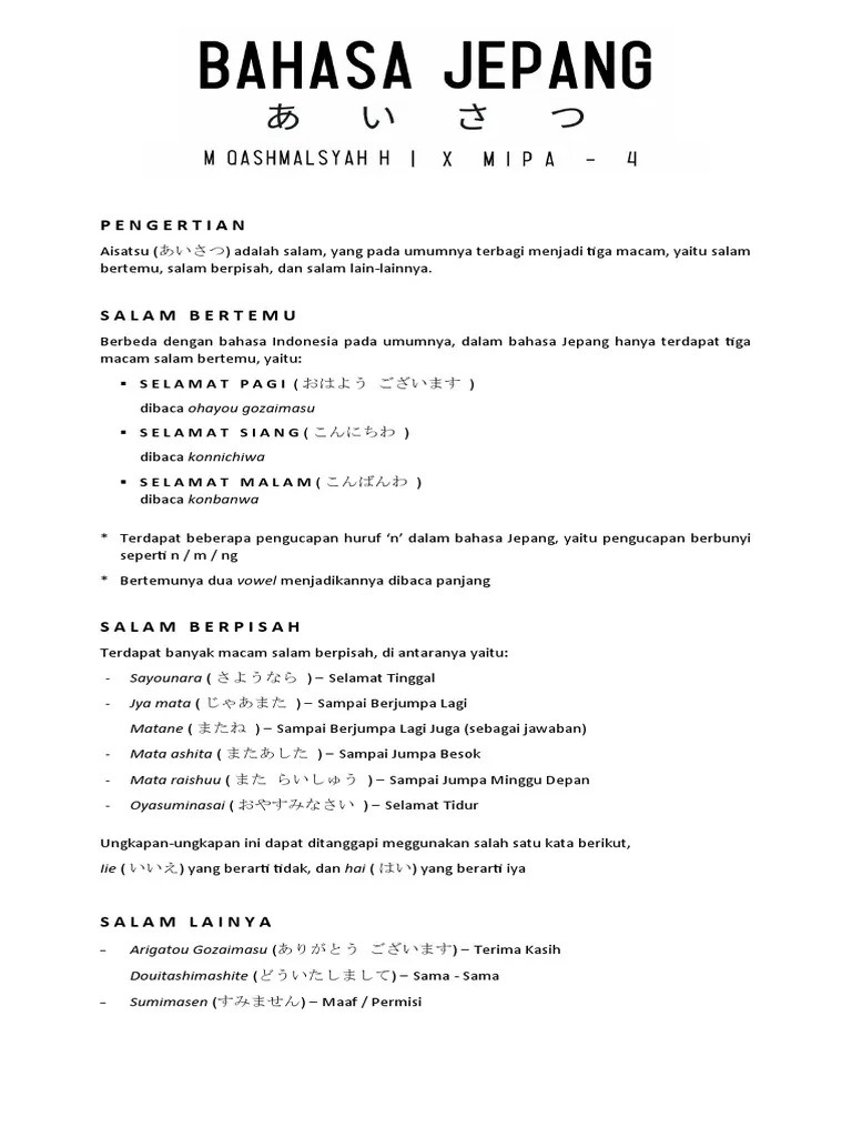 Beberapa ungkapan salam yang sering dipakai oleh masyarakat jepang antara lain : Walaupun tidak mengandung kata yang dalam bahasa jepang berarti "pagi", tapi kata inilah yang diucapkan ketika kita pertama kali bertemu seseorang suatu hari. Kore wa hon desu barang apa ya? Kami punya contoh percakapan bahasa jerman yang bisa banget buat kalian coba, percakapan bahasa. =( ucapan salam )= ohayou gozaimasu = selamat pagi konnichi wa = selamat siang konban wa = selamat malam oyasuminasai = selamat tidur.