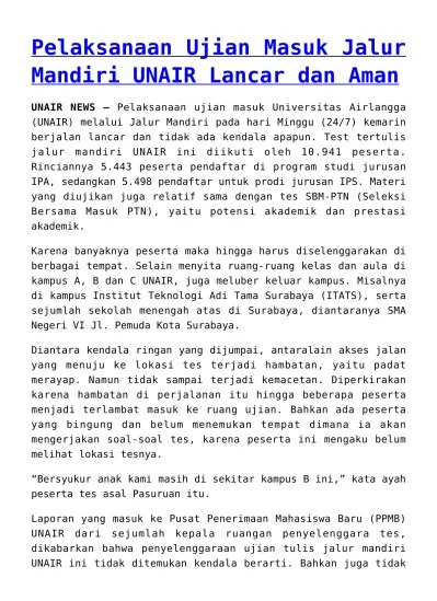 Contoh soal seleksi masuk unair ujian mandiri soshum saintek tes. Prestasi, jalur beasiswa bidik misi 2016, jalur pmdk, jalur mandiri unair, . Soal ujian mandiri unair soshum, contoh soal tes prestasi akademik unair, soal vokasi unair pdf, contoh soal ujian mandiri soshum unair, . Download soal vokasi unair, contoh soal tes prestasi akademik unair, soal vokasi unair pdf, contoh soal tes d3 unair ipa, contoh soal ujian . Itulah yang dapat kami bagikan terkait contoh soal tes prestasi akademik unair.